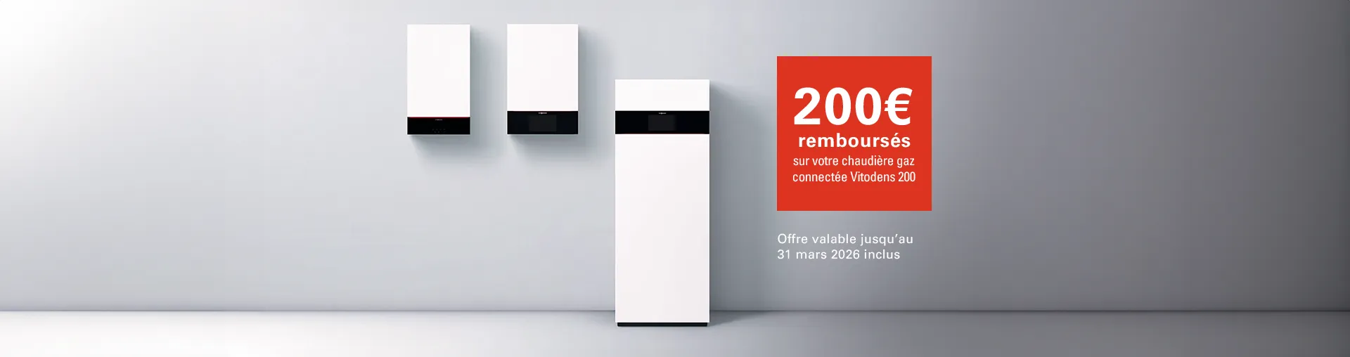 Avec Viessmann, modernisez votre chauffage pour allier performance et économies d’énergie. Pour toute chaudière achetée pendant la période de l’offre, soit entre le 26/01/2026 et le 31/03/2026, et sous réserve qu’un devis d’installation signé soit déposé dans le dossier en ligne au cours de cette même période, un remboursement de 200 € pourra vous être accordé (sous réserve du respect des modalités détaillées ici et dans la limite des offres disponibles). Pour valider votre dossier et bénéficier du remboursement, la facture acquittée devra impérativement être déposée par le Client dans son espace en ligne avant le 30/06/2026.