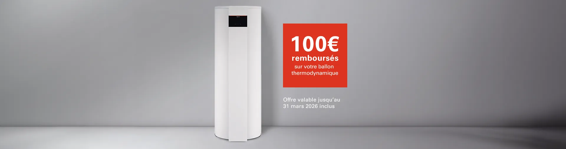 Offre valable pour toute installation d’un Ballon Thermodynamique Viessmann réalisée par un installateur professionnel avant le 30/06/2026. Pour bénéficier du remboursement, le Client devra déposer sur son espace en ligne une facture acquittée attestant de ladite installation, au plus tard à cette date, et sous réserve que son dossier soit complet.